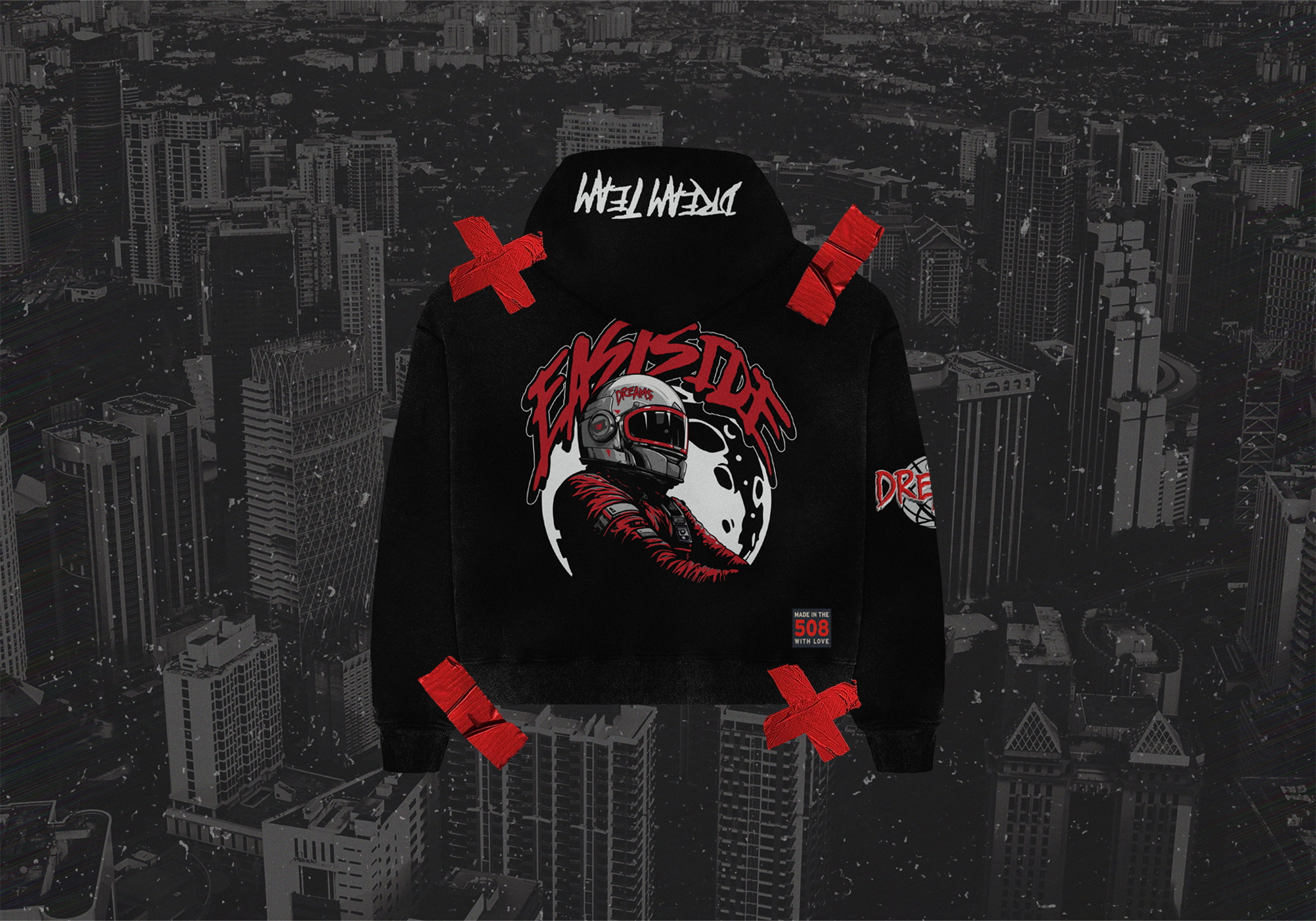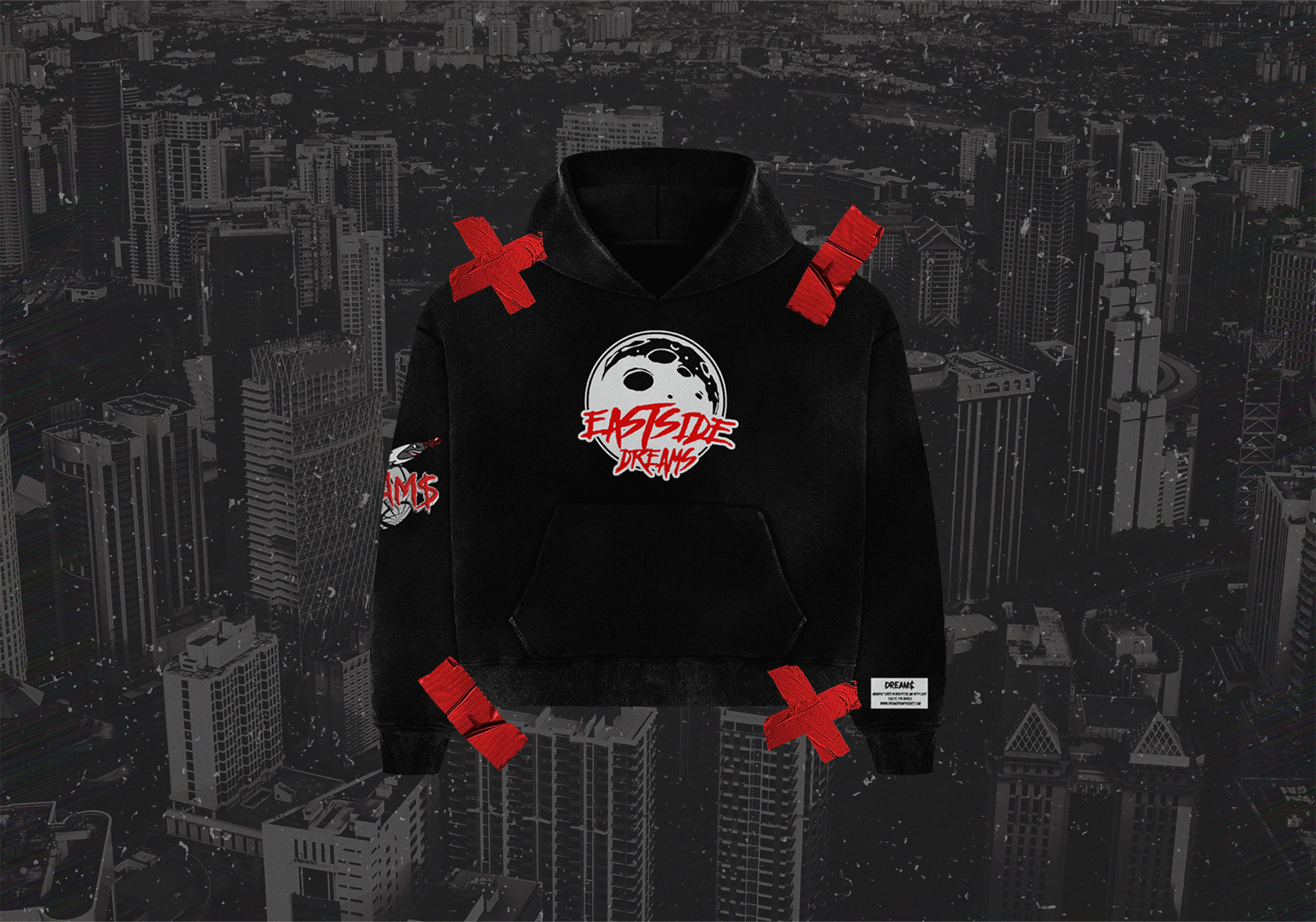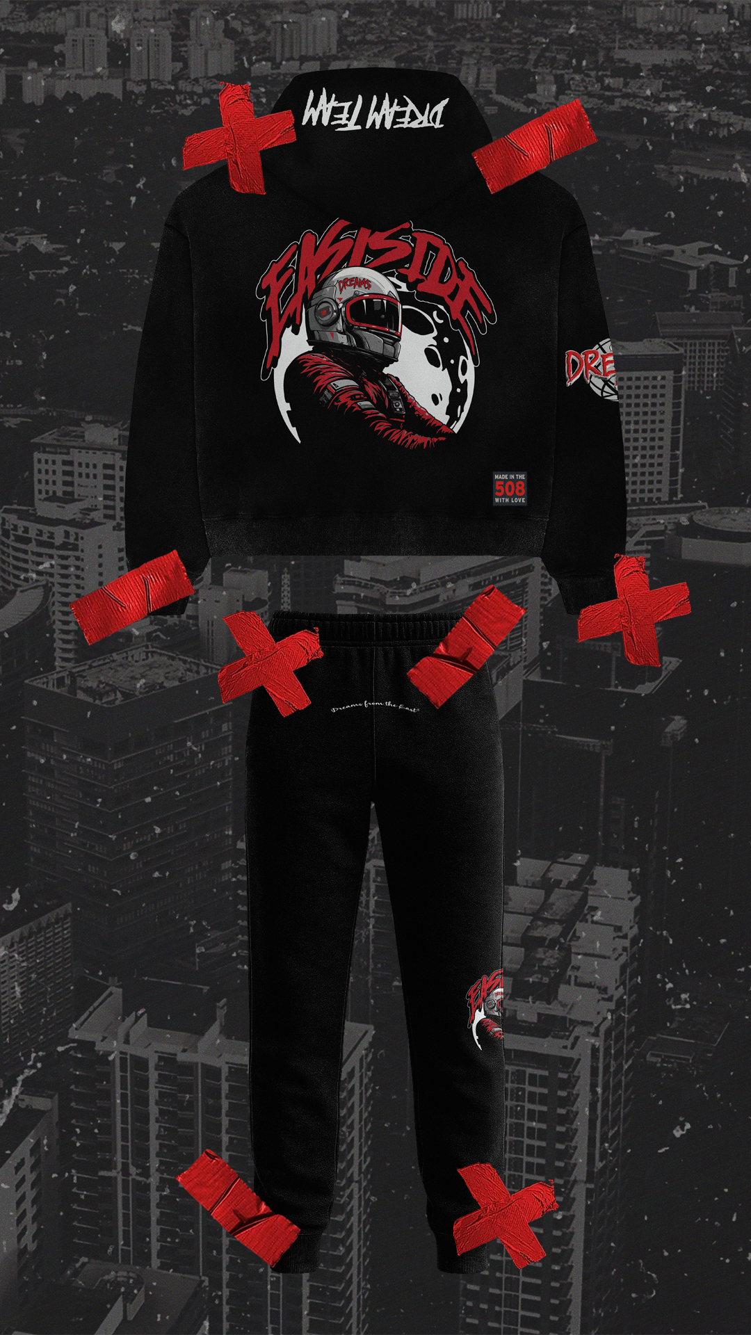 Eastside Dreams ® matching black premium cotton sweatsuit with 10" chenille Eastside Dreams moon logo on the front chest. He pants have a 5” chenille moon patch. There's a 4" embroidered moon logo on the back neckline. 4” Made in the 508 logo on the back of the hoody.